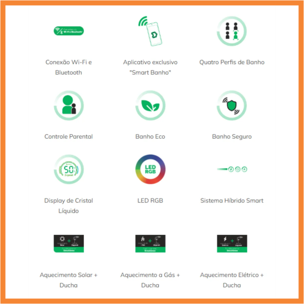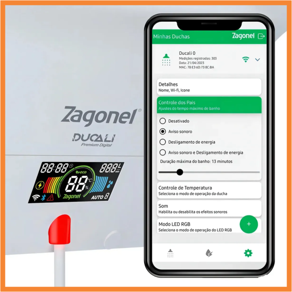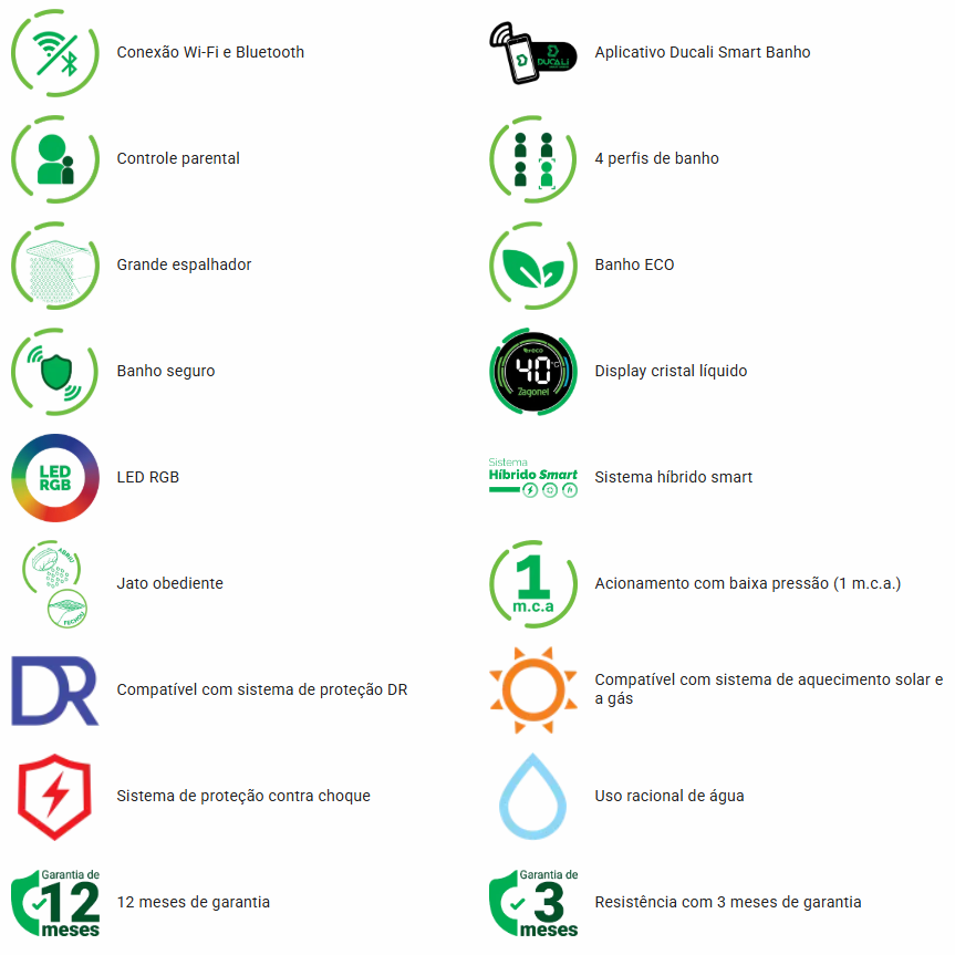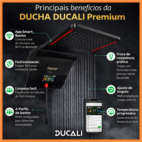 O seu banho agora é conectado e inteligente. A Ducali Premium Black eleva o conceito de conforto e tecnologia com o exclusivo Sistema Híbrido Smart, que garante o controle automático e constante da temperatura ideal. Conecte-se via Wi-Fi ou Bluetooth e tenha acesso às principais funções da ducha pelo app Ducali Smart Banho, tudo na palma da sua mão. Mais praticidade, precisão e bem-estar em cada banho.