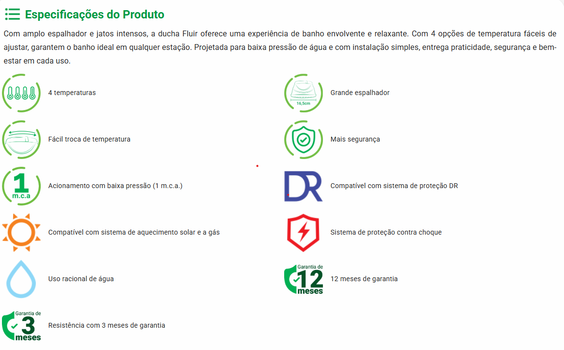 Com amplo espalhador e jatos intensos, a ducha Fluir oferece uma experiência de banho envolvente e relaxante. Com 4 opções de temperatura fáceis de ajustar, garantem o banho ideal em qualquer estação. Projetada para baixa pressão de água e com instalação simples, entrega praticidade, segurança e bem-estar em cada uso.